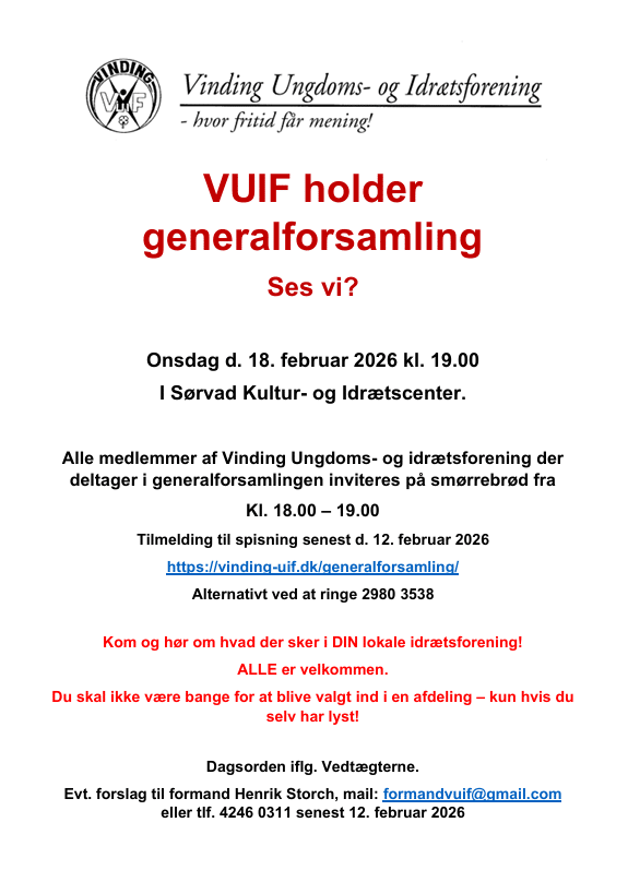 Vinding Ungdoms- & Idrætsforening blev stiftet i 1965 og er en aktiv forening med amatørteater, badminton, banko, fitness, fodbold, gymnastik, krocket, petanque, senioridræt, svømning og meget mere for både unge og voksne. Følg med her på hjemmesiden i hvad der sker hos Vinding UIF.