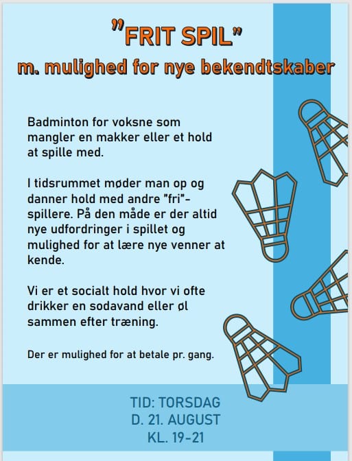Badminton for dem som ikke har et fast hold at spille med, eller ikke vil binde sig for en helt sæson. I tidsrummet møder man op og danner hold med ”fri-spillere”. På den måde er der altid nye udfordringer og mulighed for at lære nye venner at kende. Vi er et socialt hold hvor vi ofte drikker en sodavand eller øl sammen bagefter.