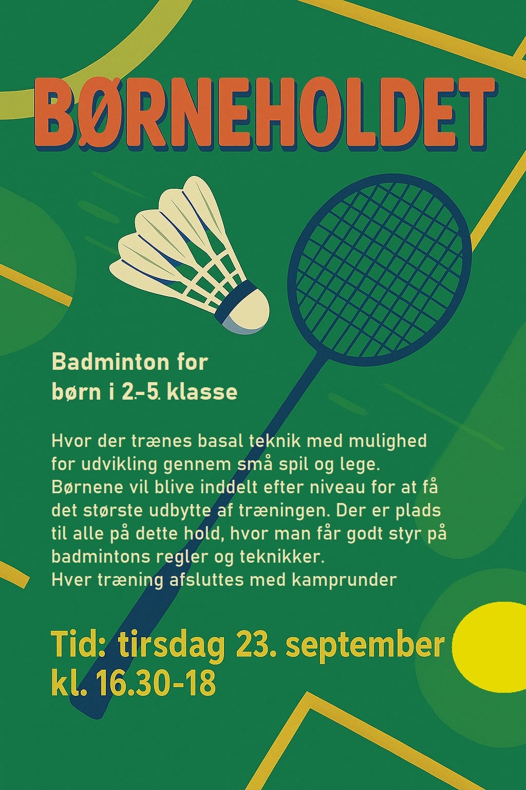 Badminton for børn i 2 – 5 kl. Hvor der trænes basal teknik med mulighed for udvikling gennem småspil og lege. Der er plads til alle på dette hold hvor man får godt styr på spillets regler og teknikker. Børnene vil blive inddelt efter niveau for at få det største udbytte af træningen. Ofte vil vi afslutte med kamprunder.