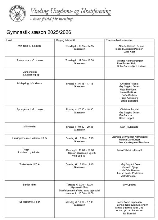 Velkommen til gymnastik på mange forskellige hold. Vores hold spænder bredt – om du er barn eller voksen kan du finde et hold der er for dig. Velkommen til et herligt socialt fællesskab. Vi synes det skal være sjovt, rart og hyggeligt at dyrke motion. Og det bliver det let sammen med andre mennesker. Skulle der være yderligere spørgsmål, kontakt formand Maja Rathkjen på telefon 4046 1842.